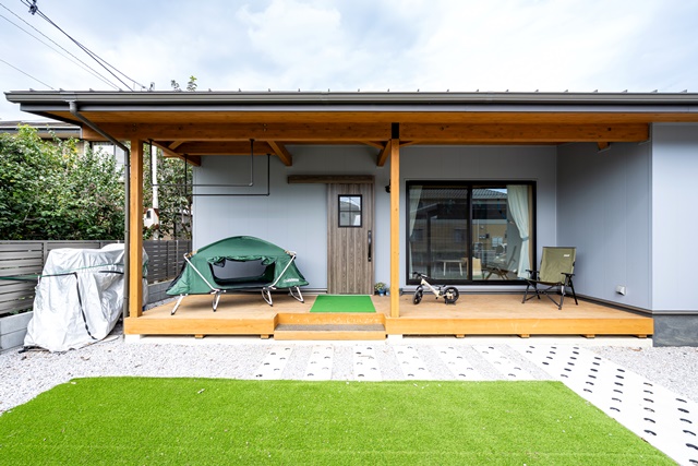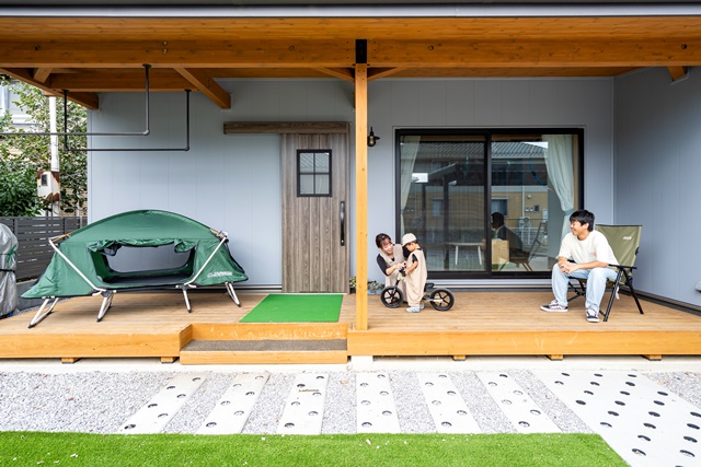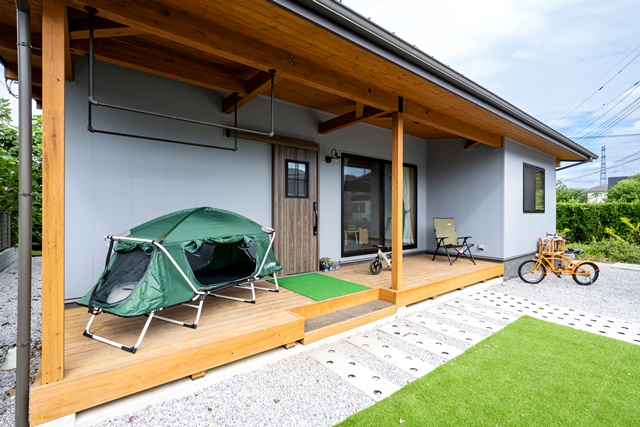 平屋で部屋が見渡せるので、子供が違う場所で遊んでいても安心出来る良さがあります。最近は子供と一緒に、リビングで車のラジコンを走らせて遊ぶのがブームです。 僕のお気に入りのスペースはウッドデッキです。天気の良い休日は、お家キャンプ気分で庭で過ごすことも多いです。 (ご主人様)