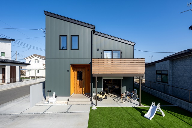 モスグリーンのガルバに芝の青が映えるWAVE。スキップフロアの構造と間取りを見た瞬間に一目惚れをして、家族がちょうどいい距離感で繋がるライフスタイルを実現した。アルミのバルコニーは1.5階のリビングから出入りでき、アウトドアストッカーの屋根にもなる優れもの。上の空間にも下の空間にも恩恵をもたらして、住まいの価値を高めるスペースとなった