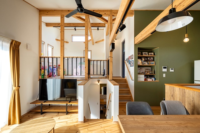リビングから数段上がっただけで、そこは特別なスペース。空気感は繋がっていながら、ほんの少しの段差が目に見えない仕切りを作り出す。大人が1.5階のスペースでお茶をしながら、子ども達が2階のセカンドリビングで遊ぶのを眺めるのも良い。もう少し大きくなってからは、リビング学習のスペースになるのも良い