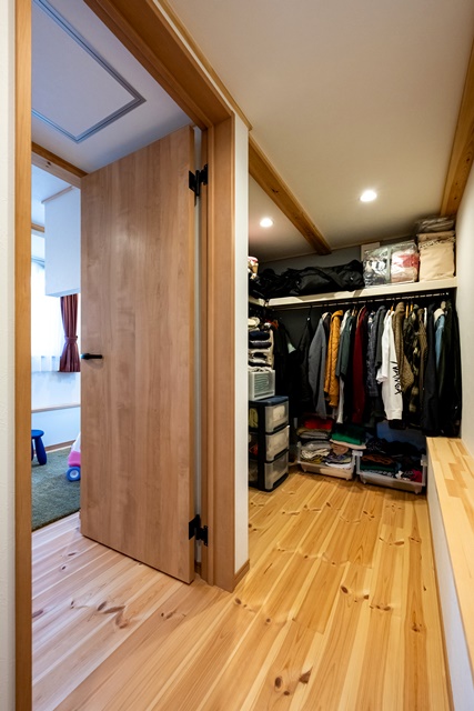 0.5階のインサイドストッカーの横にファミリークローゼットを設けて、家族みんなが通過しながら利用できるように設計した。1年に1度しか使わないものをしまい込んだり、日常使いで頻繁に着るものを掛けるのにも便利。家族以外には見えない廊下の突き当りというところがミソ