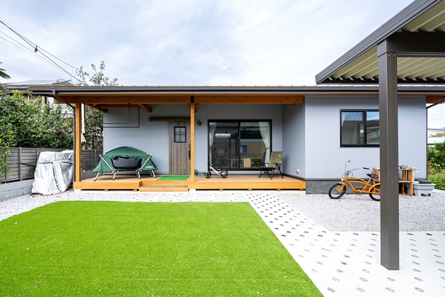 ずっと憧れていた平屋での暮らし。ブルーグレーのガルバが北欧の雰囲気を醸し出し、無垢のウッドデッキととても良く調和している。玄関は引き戸で使い勝手がよく、機能性が高い上に洋風を保っているところがお気に入りのポイント。ドアの開閉スペースが不要なので、ウッドデッキのスペースをより有効活用できる効果がある