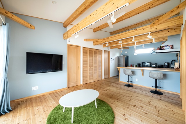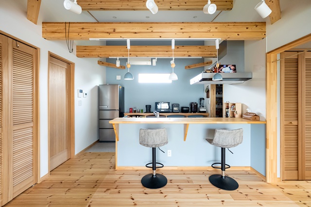 リビングのアクセントクロスにもブルーグレー色をセレクト。「この色を基調にしたい」が決まっていると、インテリアのコーディネートが進めやすい。リビング収納の扉も無垢材を使っており、経年で色づいていくのが楽しみな眺めである。子供が大きくなったら、カウンタースツールをもっと増やしたいとワクワクしている