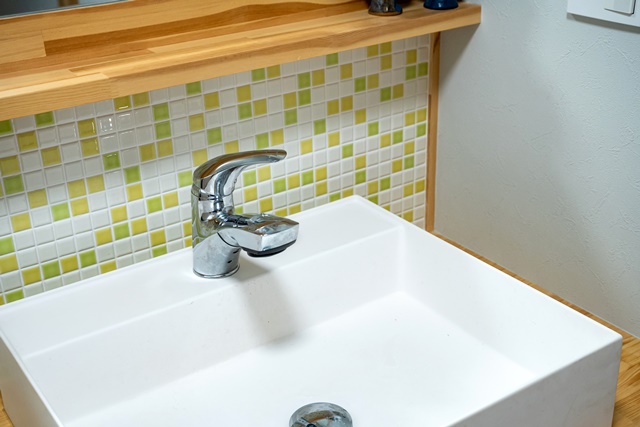 造作洗面には、可愛らしいイエロー系のモザイクタイルを採用。水栓やシンクなど一つ一つ自分で選んで、自分たちだけのオンリーワンを作り上げていくのは楽しい作業だ。モザイクタイルは、黄色や黄緑のがベースの白にどのくらいの配分で配色されるかで印象が変わる。白い部分を多く配したこちらのタイルは、キラキラと陽の光にきらめく水面を彷彿とさせるバランスとなった